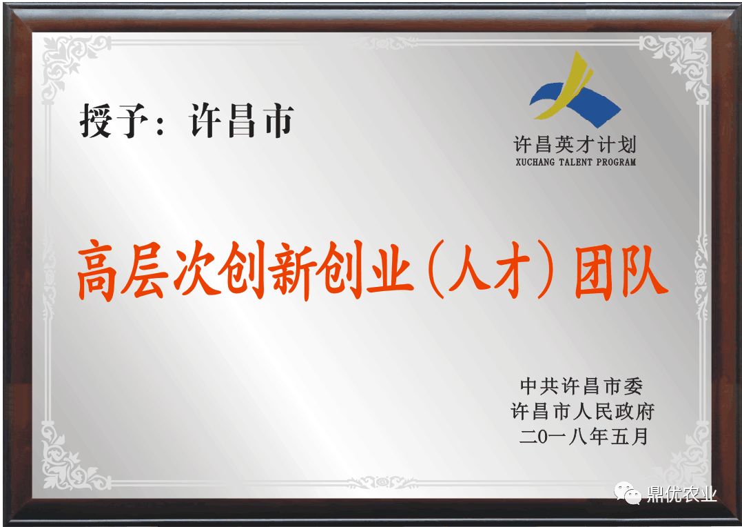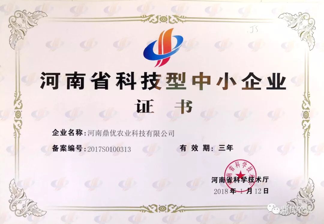 2018年1月12日,河南鼎优农业科技有限公司被评为“河南省科技型中小企业”,证书编号:2017S0100313。