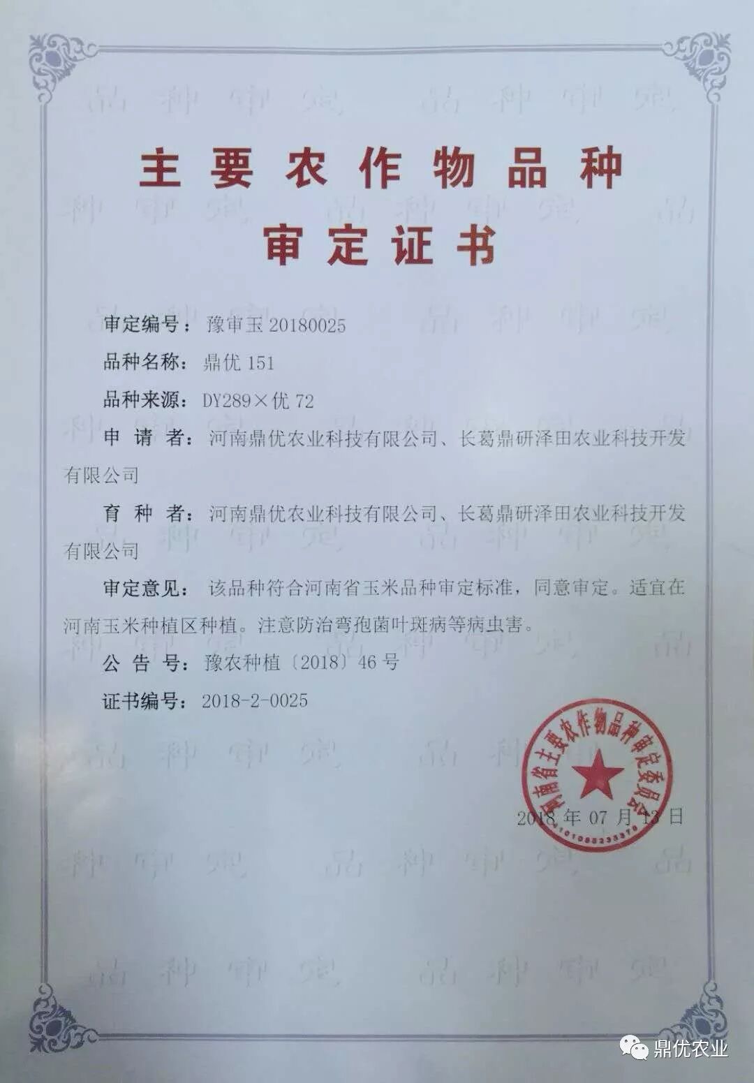 2018年7月13号,鼎优151正式通过河南省主要农作物品种审定,获得审定证书,审定编号:豫审玉20180025。